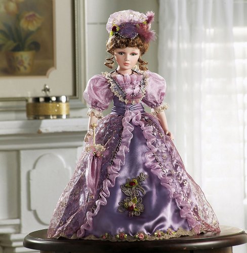 Meet a classic beauty with a passion for purple. Laura s dress is a confection of dramatic embellishments, including a lace overlay with floral and metallic-gold accents, an embroidered leaf design, and multicolor rosettes. Her auburn hair is styled in an updo and topped with a purple hat. Face, feet, and hands are bisque porcelain. She comes with a Certificate of Authenticity from the Heritage Collection. 18"H. Decoration only-not a toy....
