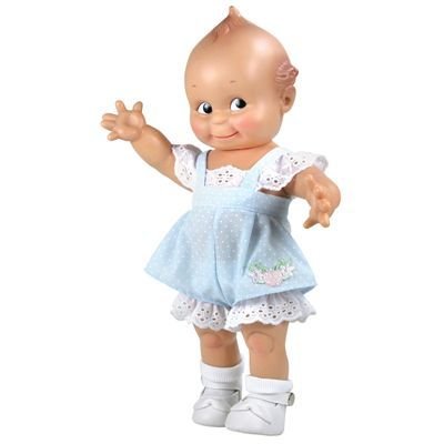 Kewpie is one of the most beloved and popular dolls of all time. Dressed in a 1940's blue and white Swiss dot romper accented with white eyelet. 8 Inch Kewpie is made of vinyl and features movable arms and legs and an impish grin. Collectible item for adults. For ages 14 and up.